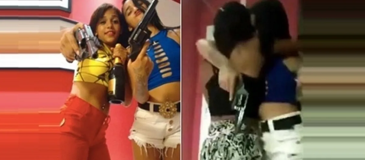 Já na foto, elas fazem pose abraçadas e segurando, além das armas, uma garrafa do que parece ser um espumante. A garota de blusa amarela tem a fisionomia de uma adolescente com idade não superior a 13 anos.