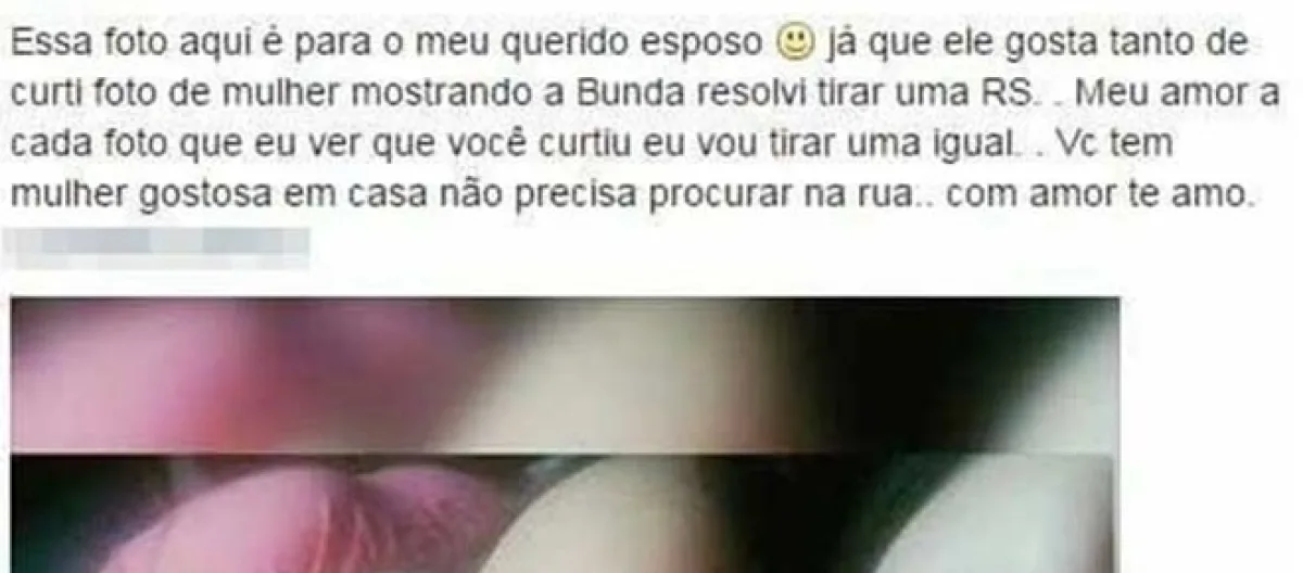 A mulher postou na descrição de sua foto uma promessa ao seu marido. A bela disse que postaria uma foto sensual a cada vez que ela descobrisse que o companheiro havia curtido uma foto de mulher com a bunda para fora.