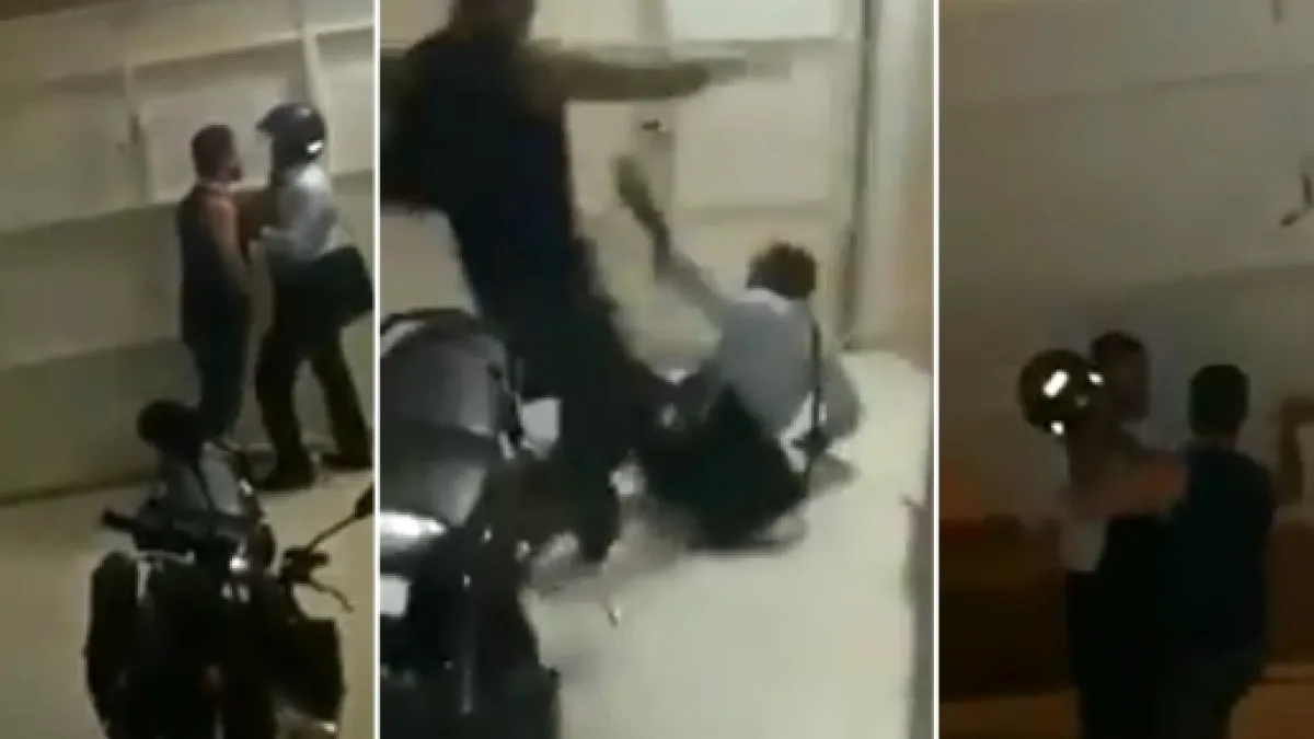 A partir do tempo de 50 segundos de vídeo, Léo começou a agredir o amigo traidor com socos, chutes e uma rasteira. “Você quer acabar com a minha família?”, pergunta o marido que teve a esposa assediada.