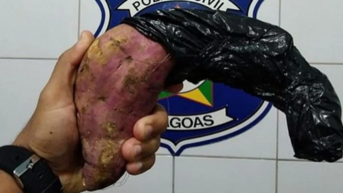 O objeto usado como arma pelo suspeito em questão na verdade era apenas uma batata-doce. O alimento estava embrulhado com um pedaço de plástico na cor preta.