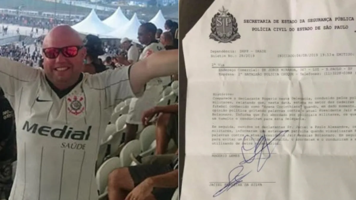 Rogerio Lemes Coelho, torcedor do Corinthians, alega ter sido preso no último domingo (4), após se manifestar contra Jair Bolsonaro durante a partida entre Palmeiras e Corinthians pelo Campeonato Brasileiro. O clássico aconteceu na Arena Corinthians e contou com a estreia do bandeirão em comemoração aos 50 anos da maior torcida organizada dos donos da casa, a Gaviões da Fiel.