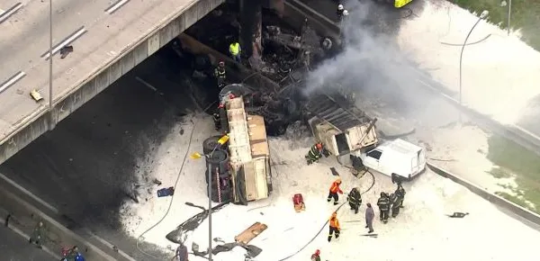 “Ela (a carreta) veio voando e caiu na Raposo (Tavares). Ela caiu em cima de dois carros e pegou a Fiorino. A explosão foi muito forte”, disse Fernando Miranda, que dirigia uma van, ao portal UOL.