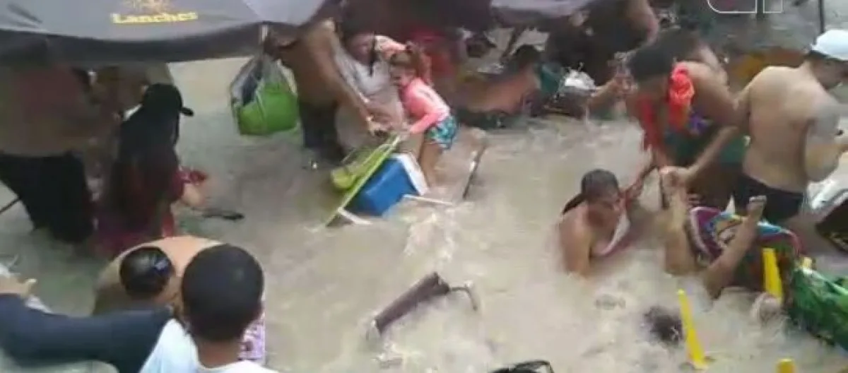 Uma mãe com uma criança também chega a ser arrastada pela força das águas. Apesar susto, não há registro de pessoas feridas ou desaparecidas.