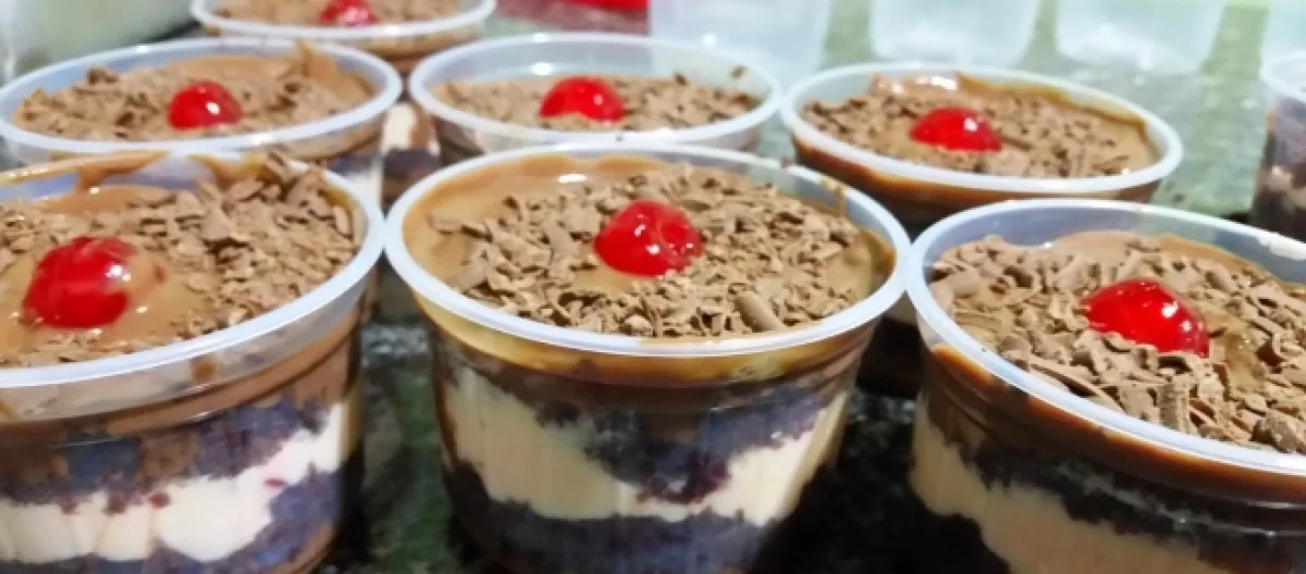 Separe os potes e coloque/monte em todos ao mesmo tempo na seguinte ordem: uma camada de ganache, uma de bolo, uma de chantili, outra de bolo, finalizando com o ganache. Faça a quantidade de camadas que você desejar e de acordo com o tamanho do pote escolhido. Decore a gosto, com chantili e cerejas ou raspas e cerejas.