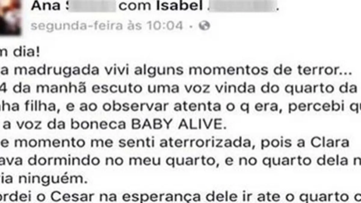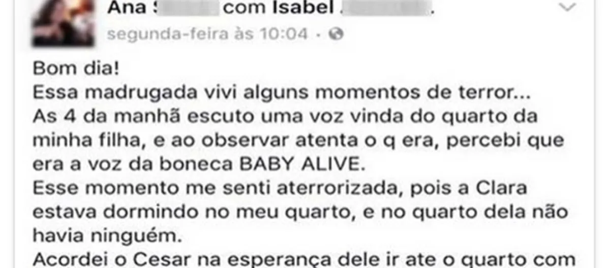 Ana inicia seu relato dizendo que a madrugada foi aterrorizante. Ela diz que às 4h da manhã escutou uma voz vindo do quarto da filha, mas percebeu, logo de início, que a voz era da uma boneca Baby Alive. Ela conta que sentiu muito medo nesse momento, pois, Clara, sua filha, estava dormindo no quarto junto com ela e o marido e que no quarto onde estava a boneca não havia ninguém.