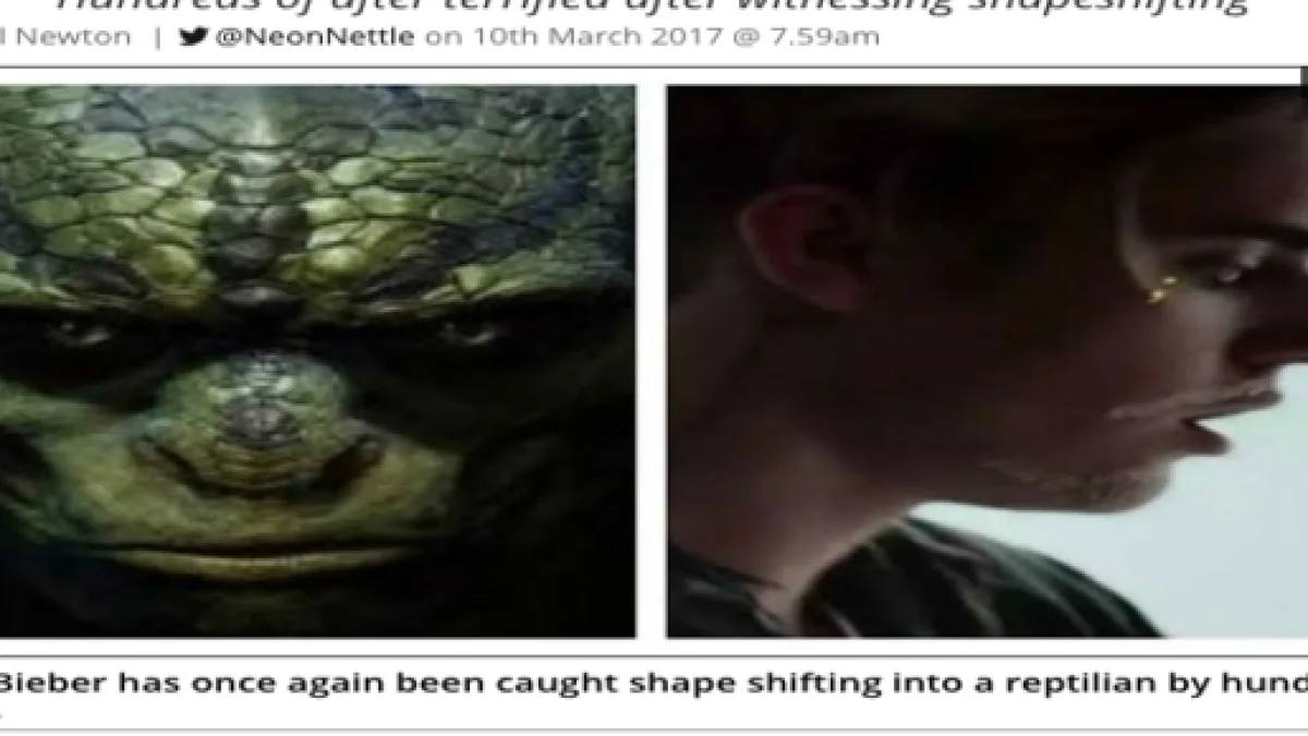 Apesar da hipotética reportagem não constar na internet, o BuzzFeed exibiu o título da notícia com a seguinte manchete: "Centenas de fãs afirmam que viram Justin Bieber virar um réptil gigante".