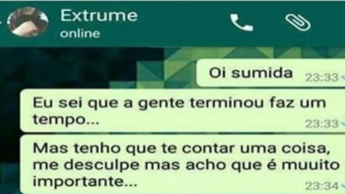 A conversa foi realizada pelo WhatsApp. Pelo print, pode-se perceber que o rapaz foi quem chamou a moça para a conversa. "Oi sumida. Eu sei que a gente terminou faz um tempo... mas tenho que contar uma coisa, me desculpa, mas acho que é muito importante", escreveu o ex.