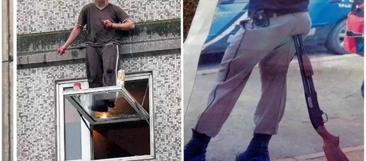 4. Depois de um dia cansativo, com uma farda quente e pesada, debaixo de um sol forte, sem lugar para descansar, o policial resolveu usar sua arma como apoio para descanso.