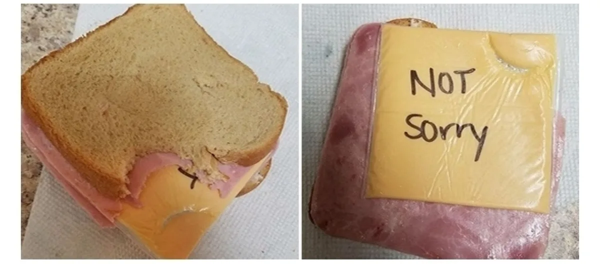Nesse primeiro exemplo, a esposa colocou um plástico em volta da fatia de queijo do lanche, para pregar uma peça em seu marido, que tentou comer o lanche sem perceber.