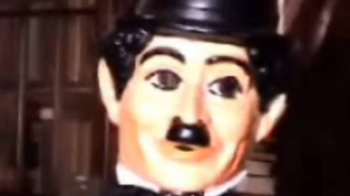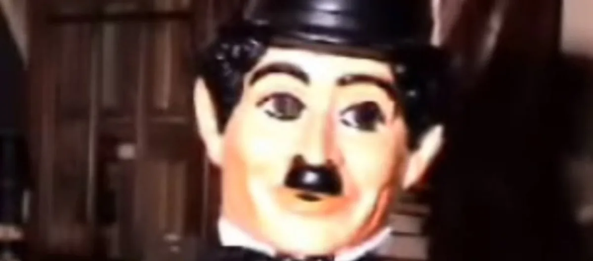 Aqui foi usada uma máscara real de Charlie Chaplin: