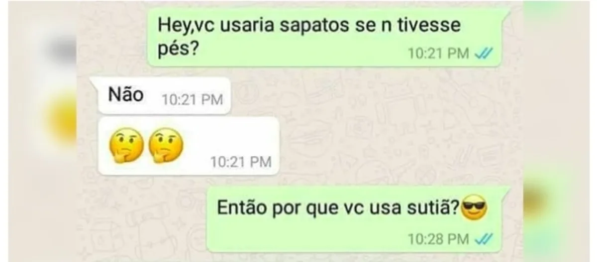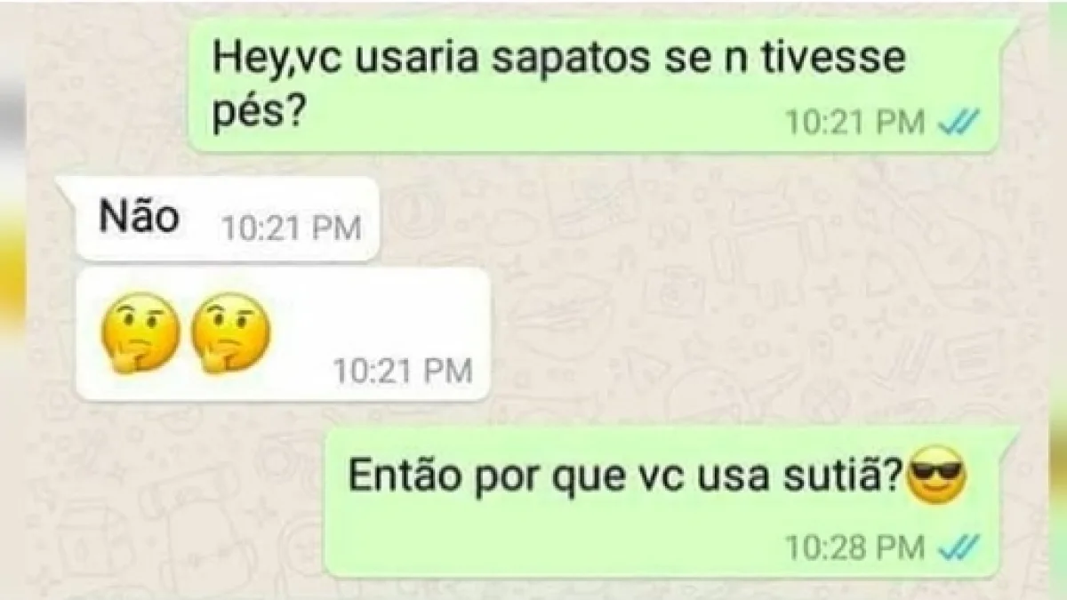 Veja a conversa na imagem abaixo, em que um rapaz faz uma brincadeira com a garota, mas acaba se dando mal, as pessoas já diziam: quem fala o que quer ouve o que não gostaria. Veja: