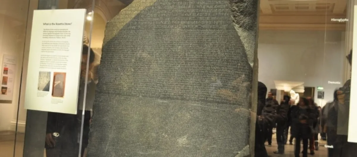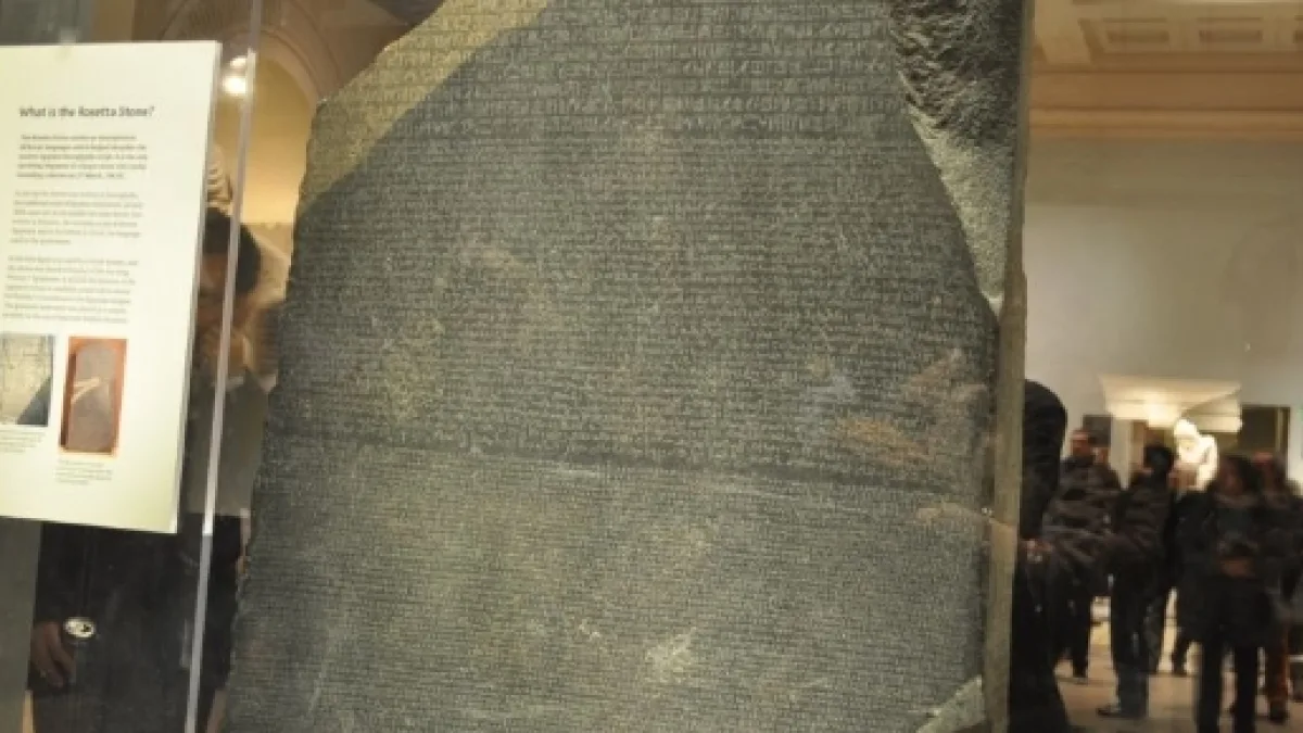 A Pedra de Roseta é um fragmento de uma estela de granodiorito encontrado no antigo Egito, cujo texto foi crucial para a compreensão moderna dos hieróglifos egípcios.