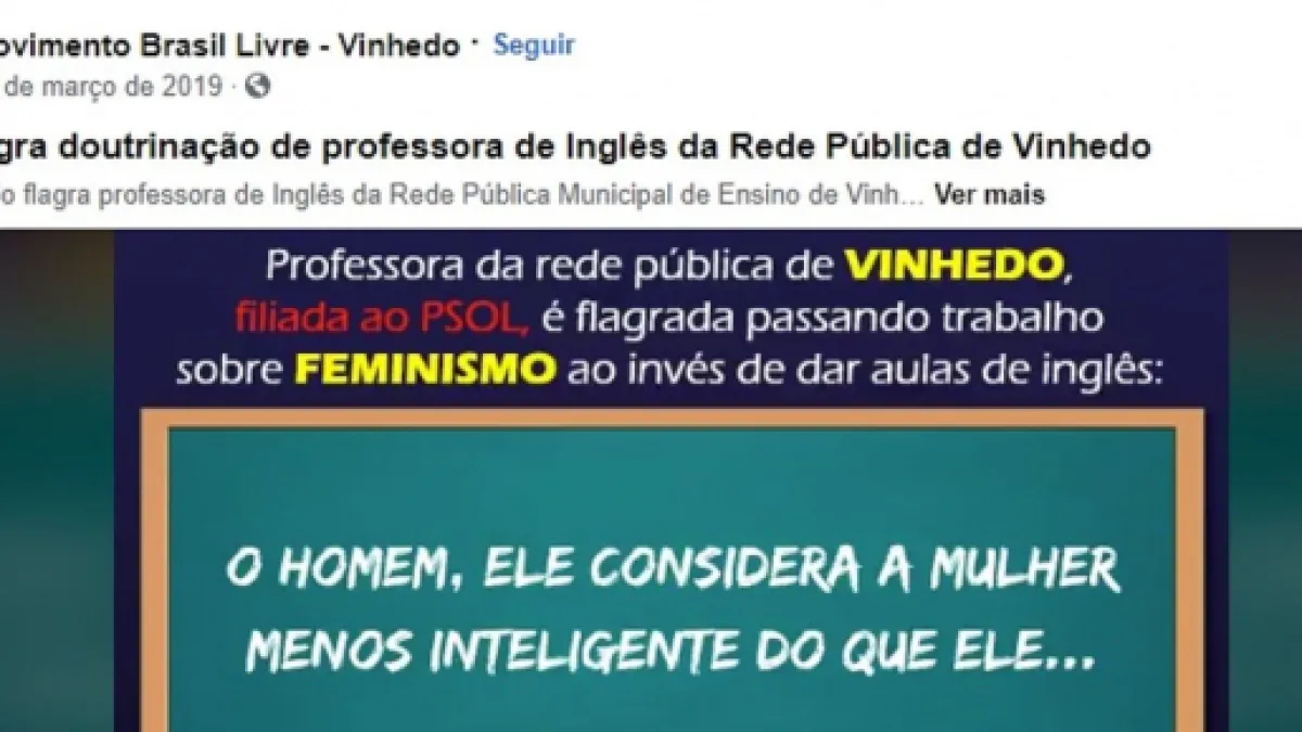 Em tom de denúncia, o MBL diz que a professora havia sido flagrada doutrinando os estudantes, em vez de ensinar inglês. A página destaca, ainda, a filiação de Ferreira ao PSOL e que, ao falar sobre feminismo, estaria "subvertendo valores para impor sua visão política".
