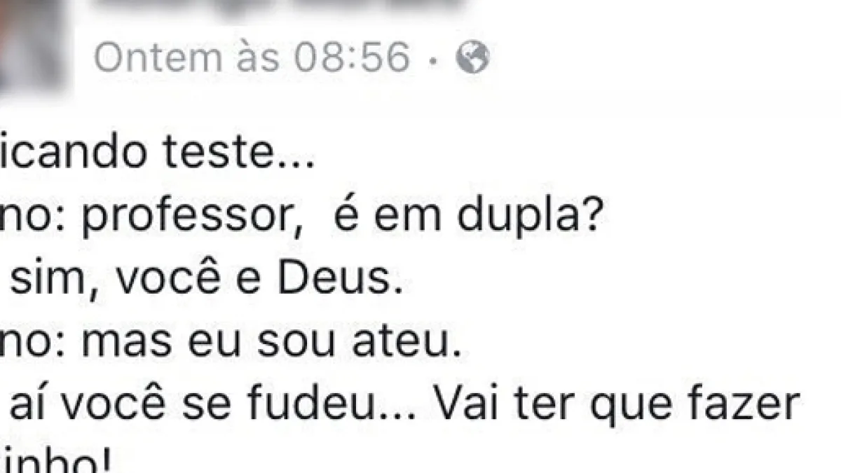 Esse professor é daquele tipo de pessoa que dá a mão, mas cobra o braço. Veja só, ele disse, em sala de aula, que acha normal seus alunos "colarem". Mais tarde, no Whatsapp, ele solta essa: