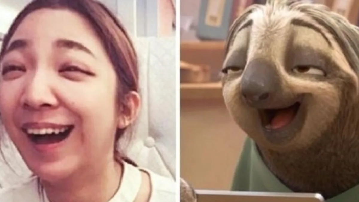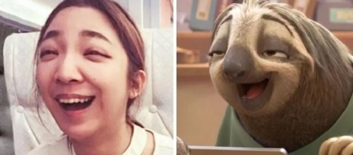 A sorridente menina da foto acabou se parecendo com o bicho preguiça de um desenho animado.