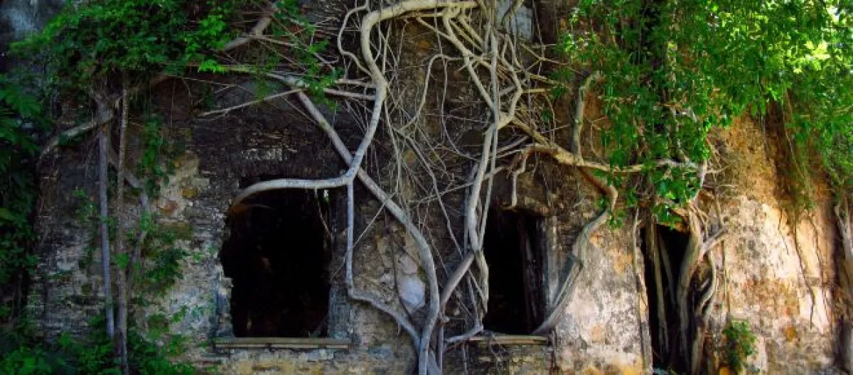 A simbiose derivada desse emaranhamento, permitiu que a igreja se mantivesse de pé. Quem observa, não é consegue afirmar se a árvore que se sustenta as paredes da igreja, ou o contrário. No entanto, a natureza parece apenas ter dado novos adornos aos velhos contornos: Os galhos sustentam e compõem as paredes.