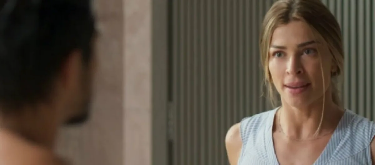 Em seguida, a costureira chega no local e flagra Marcos acompanhado da atriz contratada por Diogo